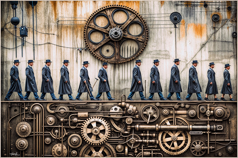 Die sepiaartige Alterung sollte Zeitlosigkeit erzeugen. Dieses Bild handelt nicht nur von Industrialisierung. Es handelt von jedem Zeitalter, in dem Menschen in Strukturen eingebunden sind, Fabrik, Büro, Gesellschaft, Algorithmus.
