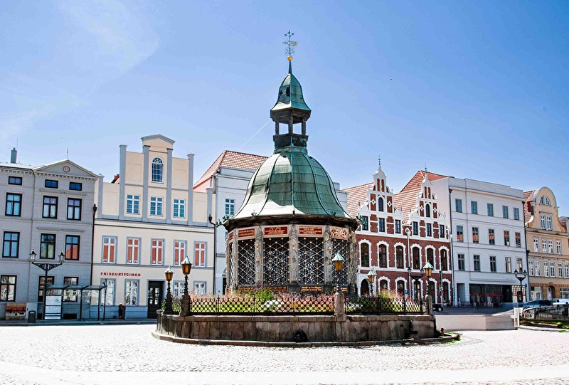 Der Pavillon aus dem 17.Jahrhundert diente einst der Trinkwasserversorgung. Der Marktplatz ist das centrum der Stadt Wismar und Unesco Welterbe,